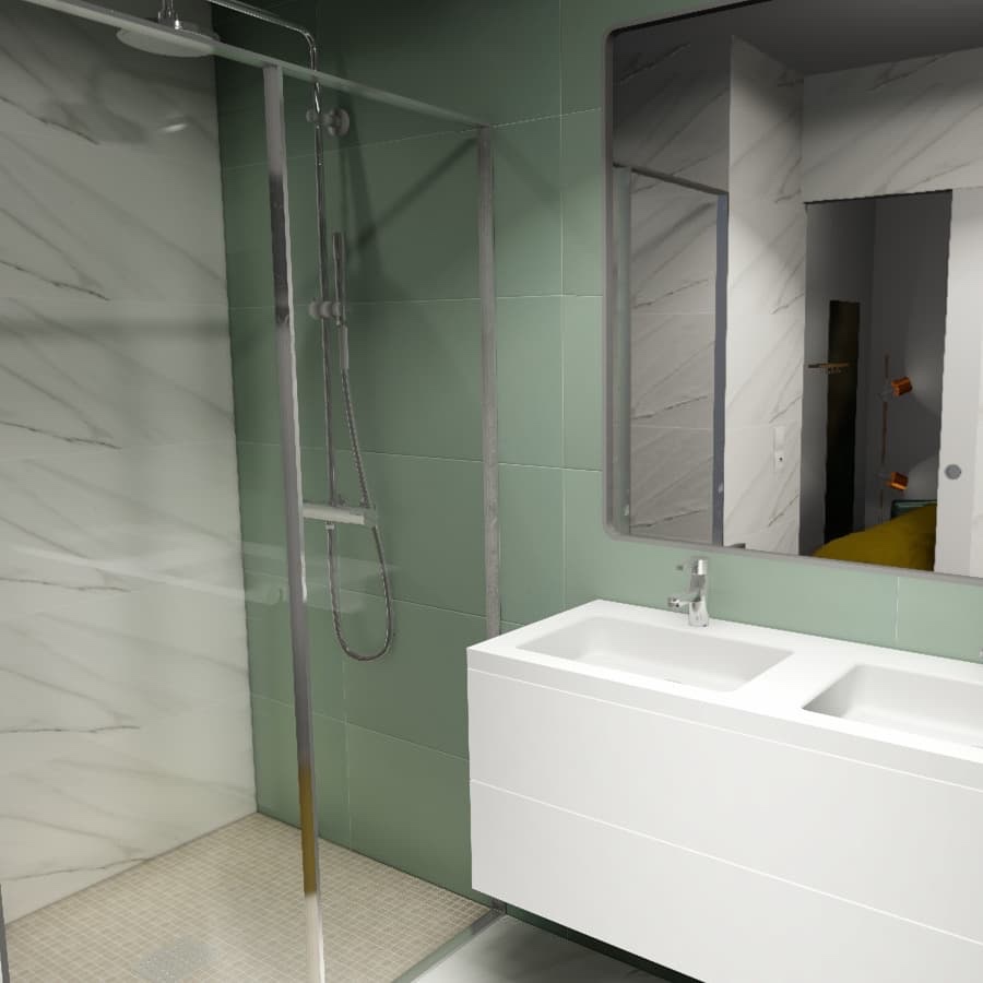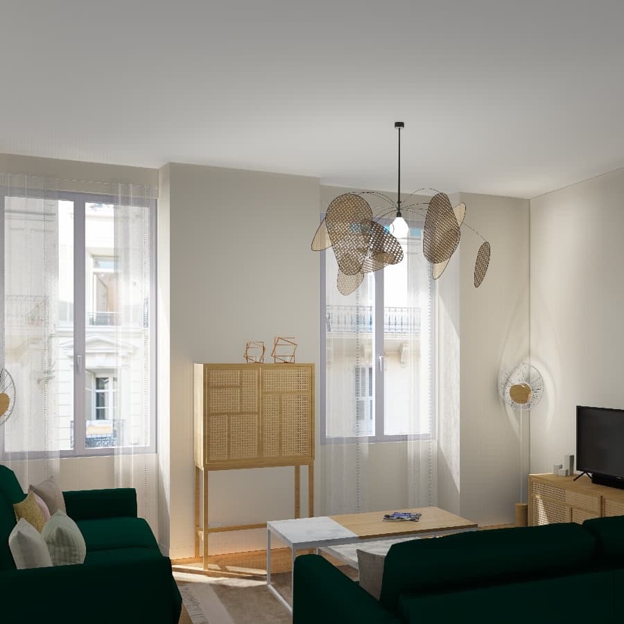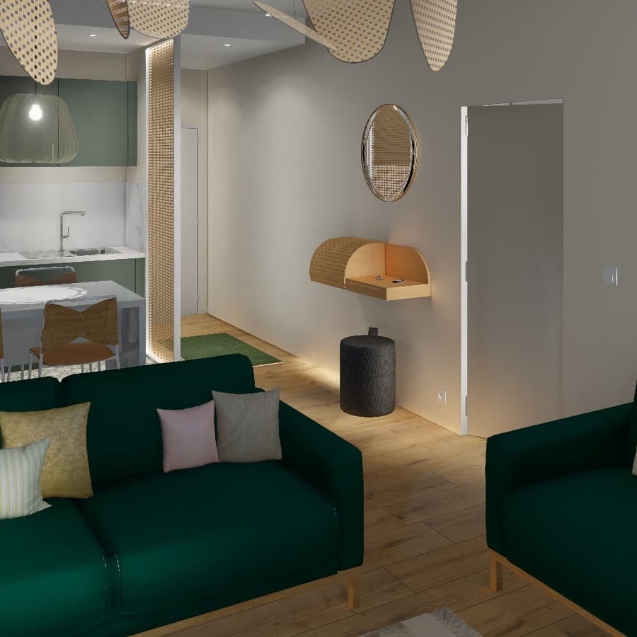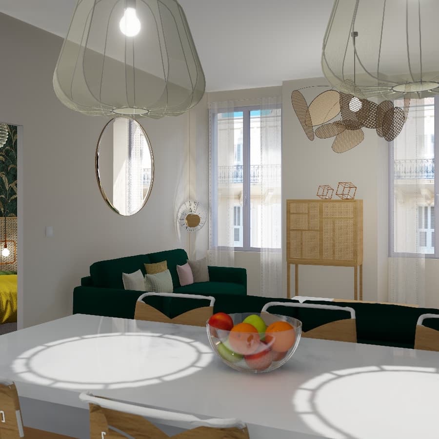 Ce bel appartement de vacances situé dans un immeuble type art déco avait besoin d’une vraie patte décorative en lien avec son environnement. Nous avons donc opté pour un mix de bois naturel et de marbre, mais surtout un mélange de teintes audacieux : palette de verts et de roses poudrés. La douceur et la lumière sont de mise dans ce lieu. Des éléments de décoration vintage revisités viennent accompagner les différents papiers peints panoramiques sélectionnés par nos soins.