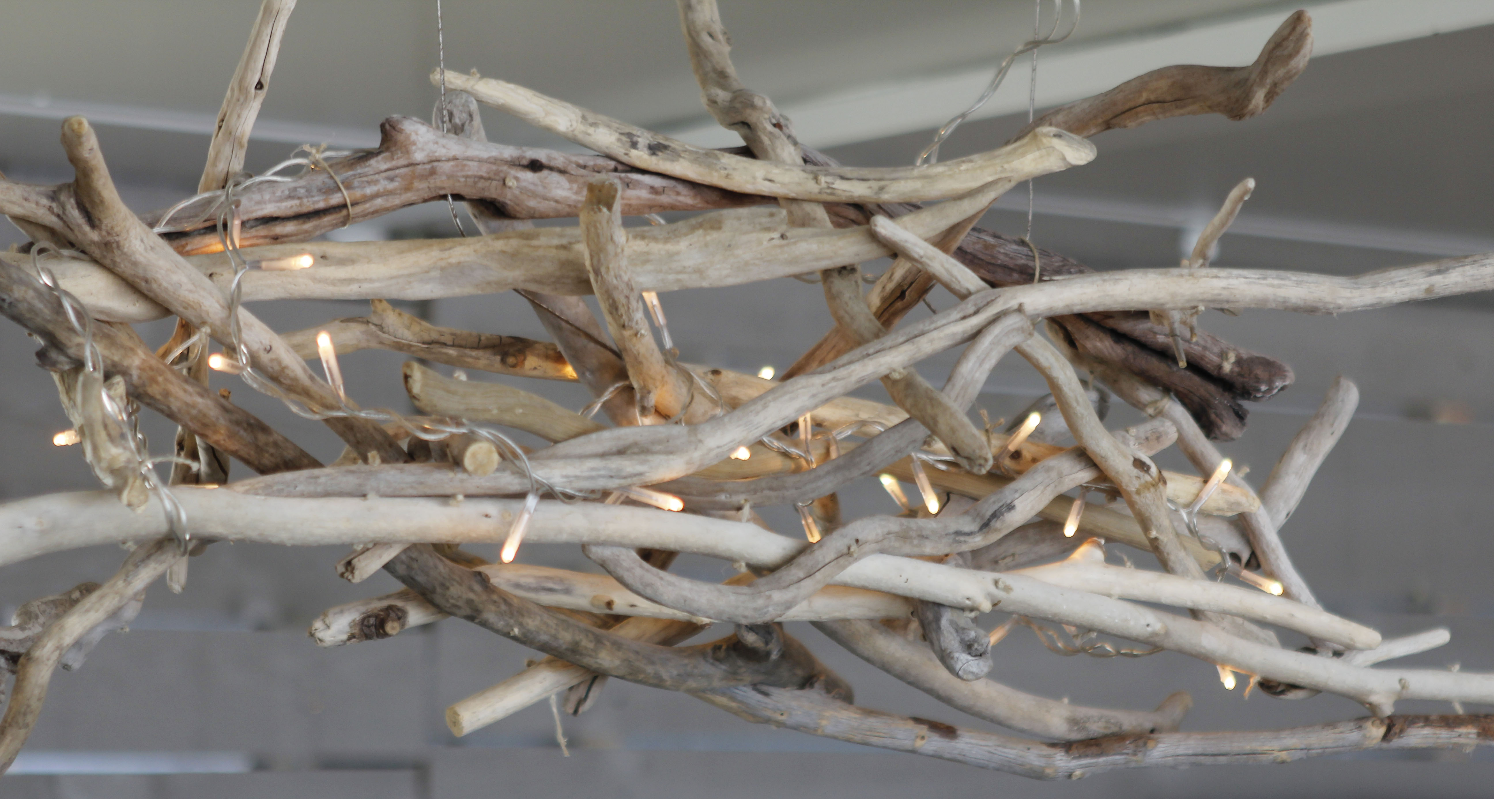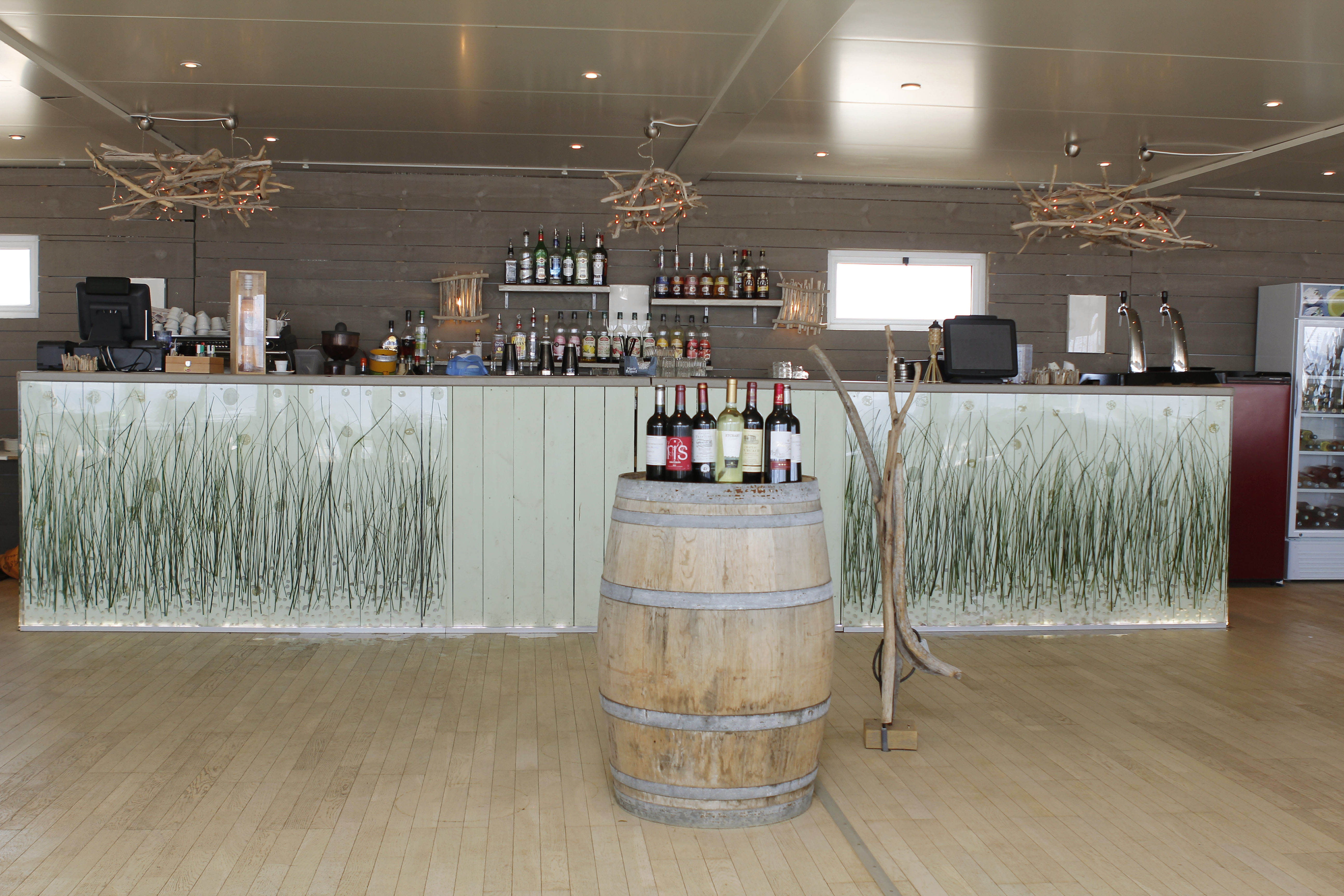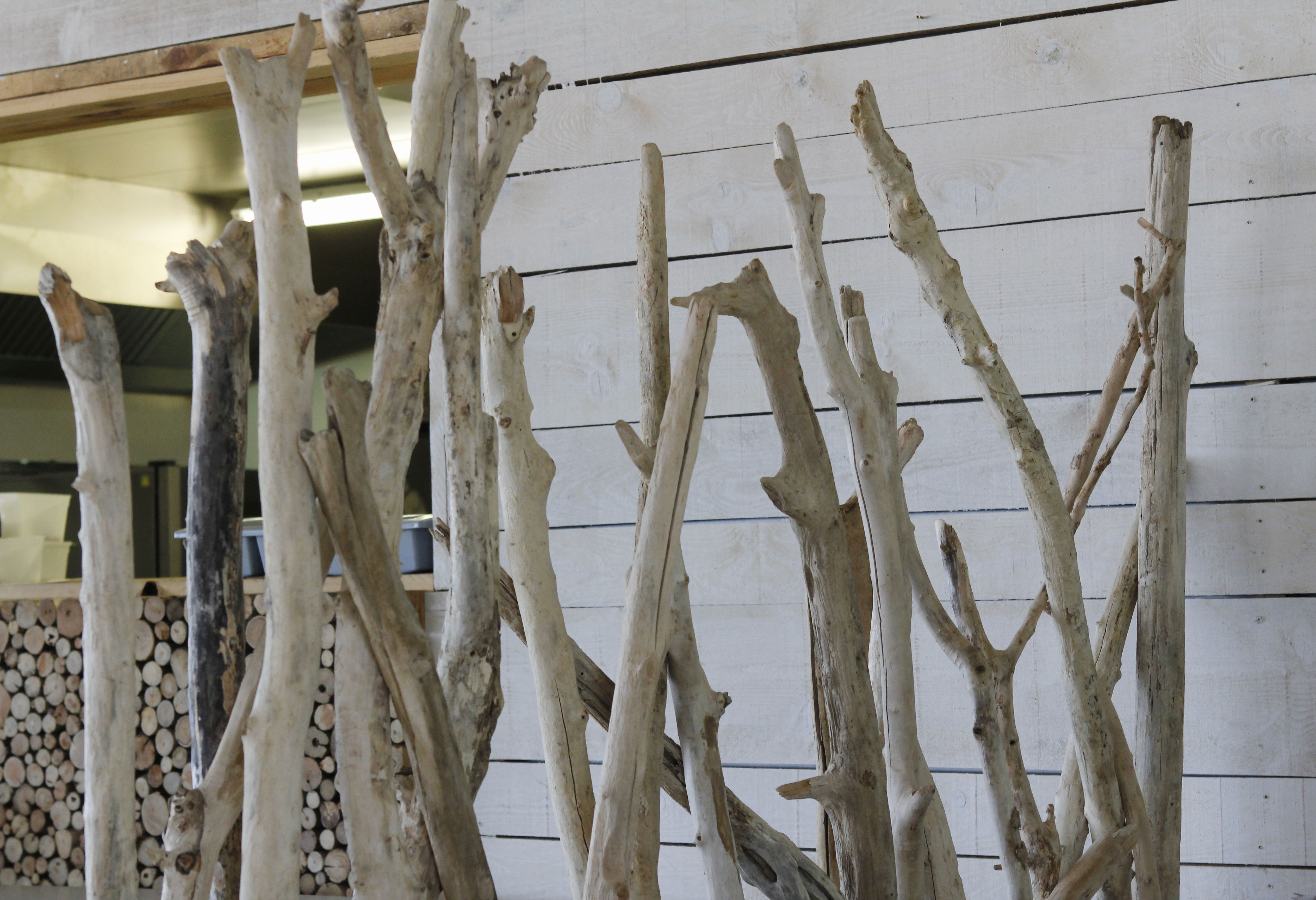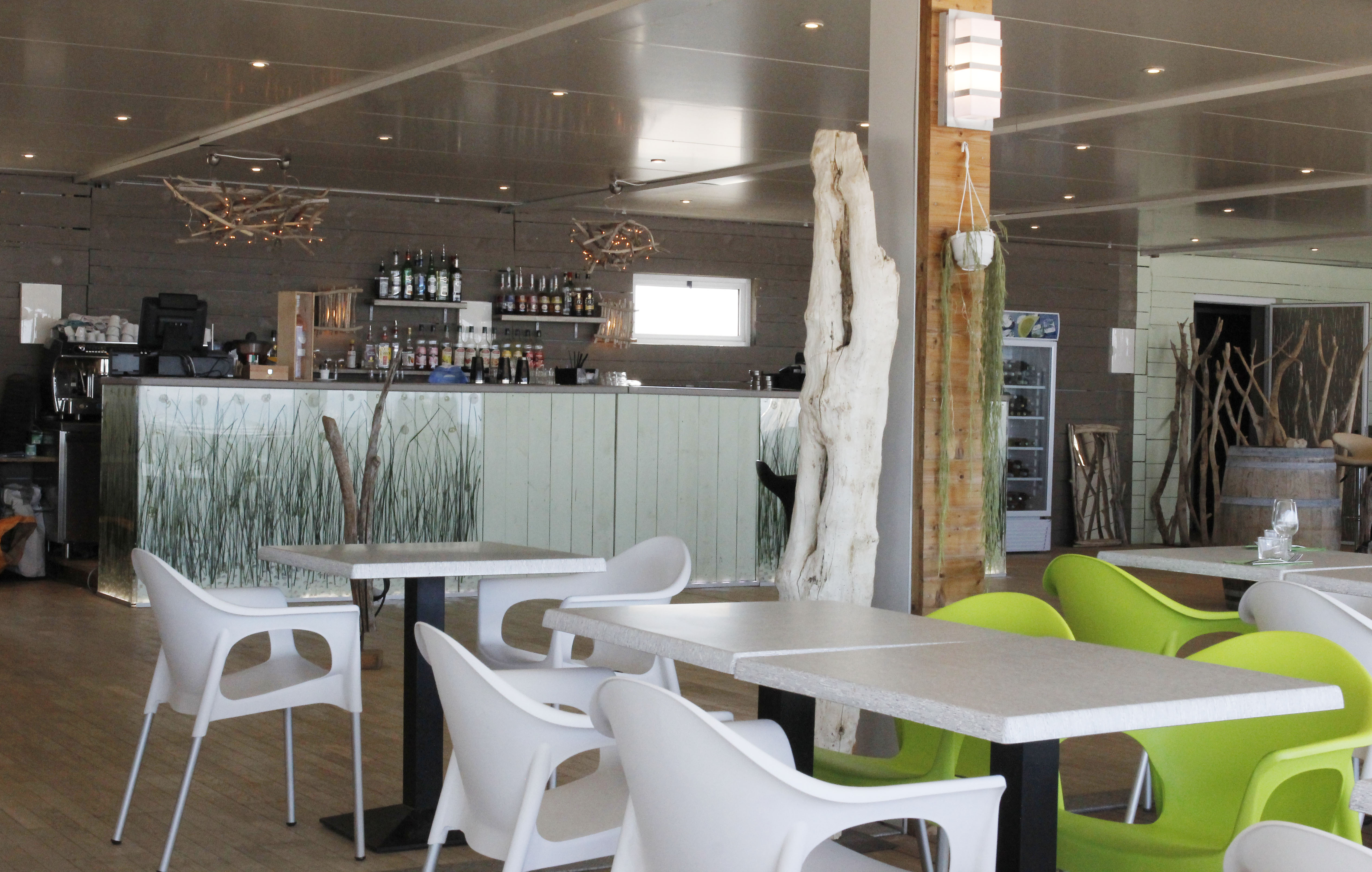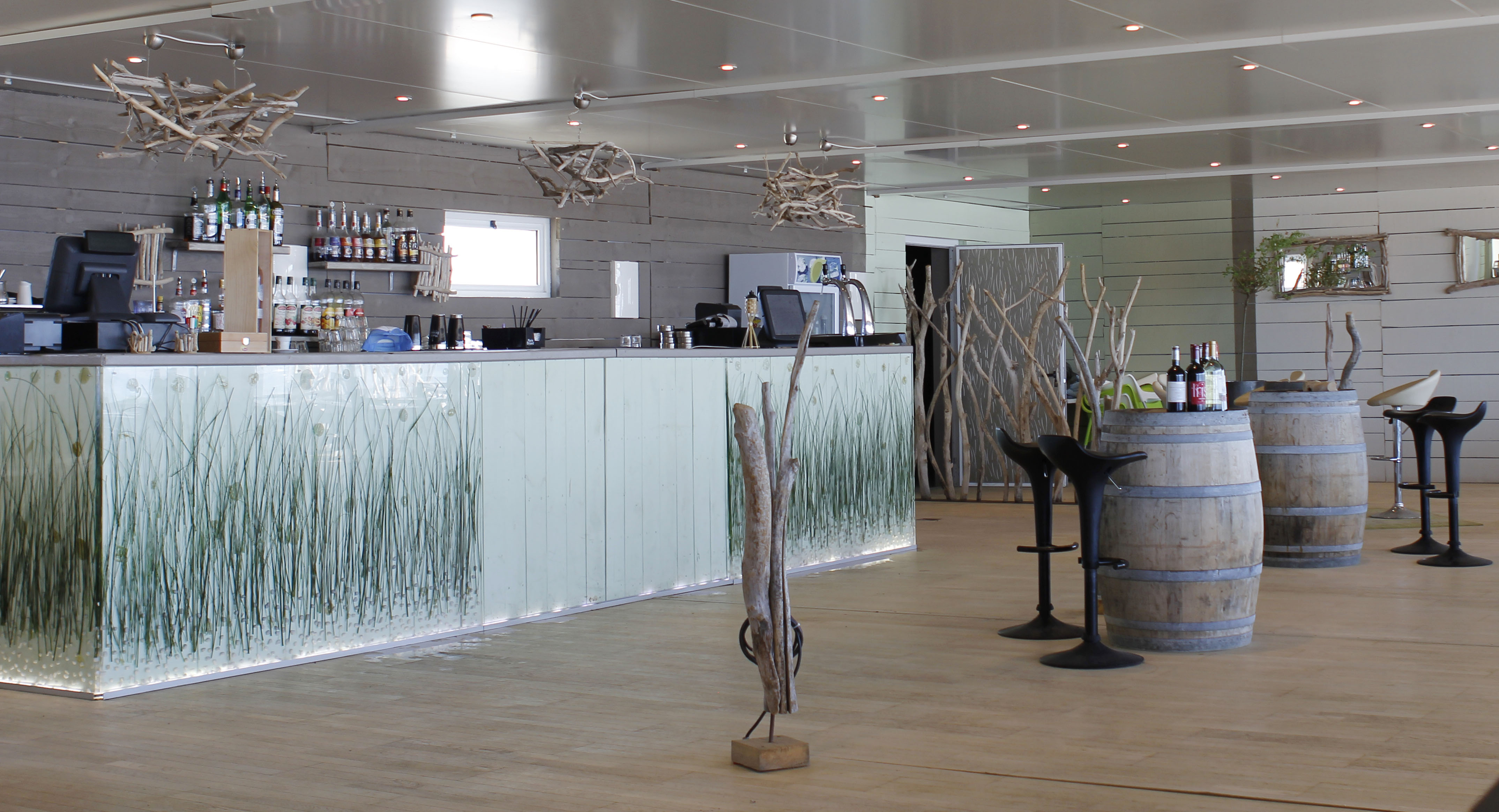 Sur ces plages du bord de l’océan, les éléments sont puissants et bruts. Il fallait alors coller à cet environnement en apportant une touche de douceur a la décoration. Entièrement pensé pour harmoniser l’intérieur et l’extérieur, le bois flotté s’est imposé en ligne conductrice du projet. Sculptures d’artistes, luminaires conçus sur mesure, paravents en bois flotté et plaques de bois debout en revêtement mural, rien n’a été laissé au hasard. Un immense bar en matériau Dacryl (avec inclusions d’herbes folles et de galets) est le clou du spectacle. Les teintes de verts tendres et de craie utilisées pour les murs permettent d’adoucir l’ensemble.
